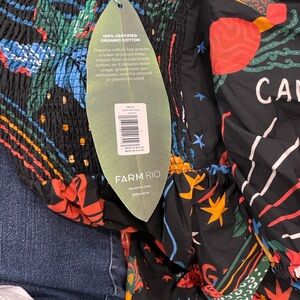 FARM Rio dress with vibrant floral and fruit design. Crafted from organic cotton. Eye-catching and sustainable.