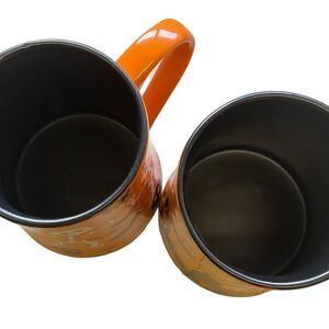 A set of 2 of the most adorable halloween mugs. Eli & Ana handmade ceramics, 2021, Dishwaher and microwave safe. The mugs are a bright orange with skeltons, bats, bones, pumpkins done in black and white. The inside of the mugs is black.