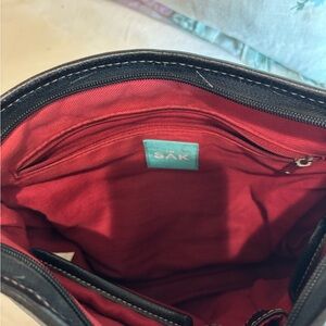 SAK black leather shoulder bag or purse. Measurements in photos. Nice medium size. Very roomy with pockets inside and out. Red cloth interior. Very good to excellent used condition. Smoke-free home.