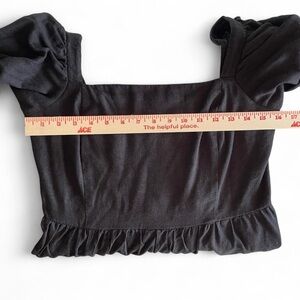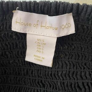 House of Harlow 1969 Puff Sleeve Mini Dress. Features smocking in the back for stretch. Nice defined waist and a two-tiered ruffle hem. Hits above the knee / knee length. Perfect transitional piece for fall - can be dressed up or down. Square neck.