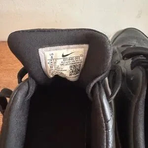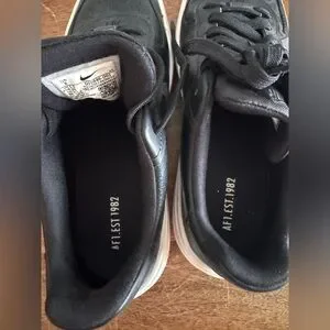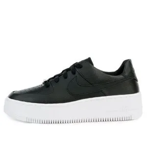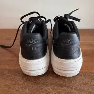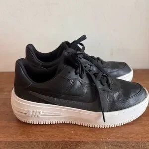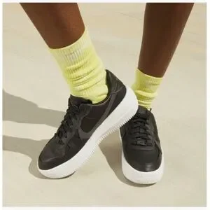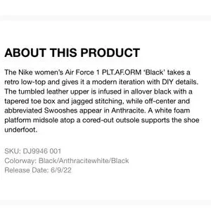The Nike women’s Air Force 1 PLT.AF.ORM ‘Black’ takes a retro low-top and gives it a modern iteration with DIY details. The tumbled leather upper is infused in allover black with a tapered toe box and jagged stitching, while off-center and abbreviated Swooshes appear in Anthracite. A white foam platform midsole atop a cored-out outsole supports the shoe underfoot.
