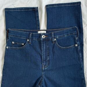 Super comfy straight leg jeans. Everlane High Key Stovepipe in Dark Indigo. High waist, 94% cotton with built-in stretch. Very soft! These can be dressed up or down. A great closet staple. Waist 14.5”, rise 11”, inseam 28”. Excellent used condition.