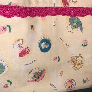 Tea pot pattern pale yellow cotton fabric with cute lace trim & a pink tassel - see photos for details