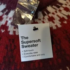 Cozy sweater with a vibrant red and pink pattern. Perfect for chilly days.