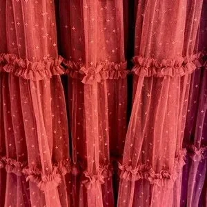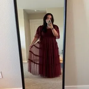 Step out in style with this elegant burgundy tulle dress from Jessa Kae . Perfect for any occasion, this dress offers a flattering fit and a touch of sophistication. Smocked bust for flexibility in sizing. Generous in the tummy area as well.