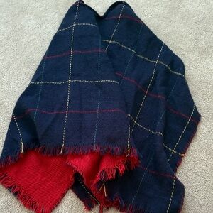 Cozy knit poncho with fringe. Bold red and Navy Design. Perfect for layering. Adorable! Excellent condition!