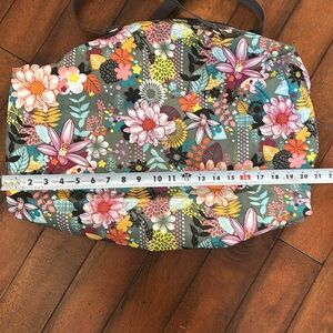 This duffle bag is a vintage style that has long been discontinued. The colors are so bright and cheerful and it’s such a fun bag to take on weekend trips or as a carry-on. Please review all pictures, as due to its vintage nature, there is some wear (including marks on the bottom of the bag). I have done my best to photograph all imperfections that I can see but please keep in mind there may be a few I missed. ** please see photo that shows a small hole in the back. ** This can easily be fixed by sewing or with a little fabric glue. This bag is however, is in quite good condition considering how much it was used and how old it is.