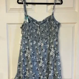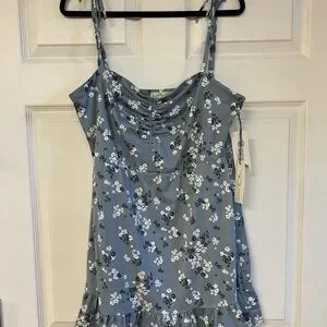 Chic blue dress with floral design. Features subtle white and darker blue flower details. Made from the softest material!