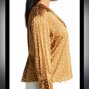 Sleek silk forms our dotted sculptural shirt, finished with a sensational sleeve and a shirred peplum at back to emphasize the waist.