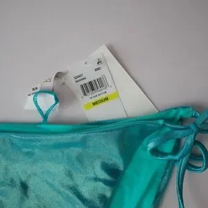Shine in this gorgeous Becca Liquid Metal Side Tie Bikini Bottom in a stunning Bermuda blue-green metallic foil finish. ✨