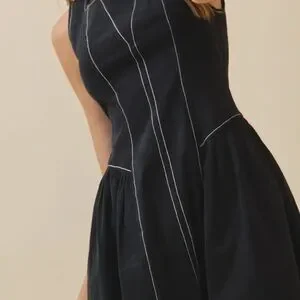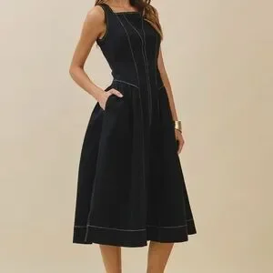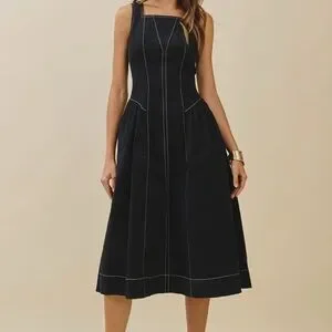 Chic black midi dress by TCEC. Features white stitching and sleeveless design. Perfect for versatile wear.
