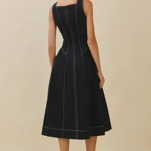 midi dress with a square neckline, contrast topstitching, and paneled seams. Features a fitted bodice, flared skirt, side pockets, and hidden back zipper closure.