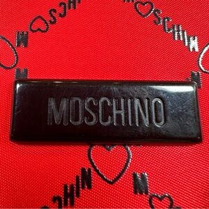 Stylish red clutch with heart pattern. Features Moschino branding.