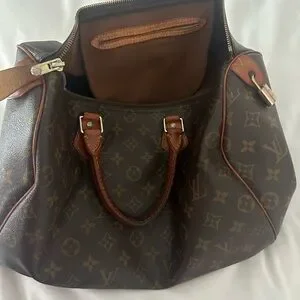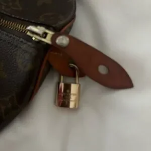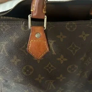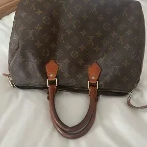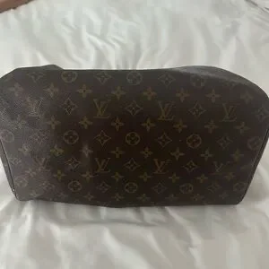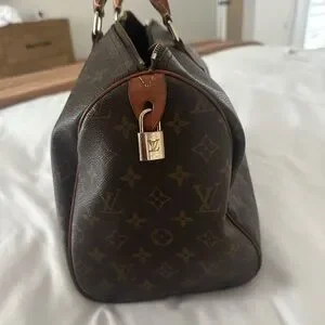 Louis Vuitton Monogram Speedy 35. Well loved, but still holds its integrity and can be revamped with new leather, handles and hardware all around or not! Would look very cute with bag charms and bandeau scarves :) No key or dust bag.