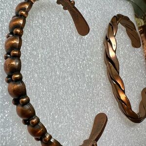 Lot of 4 vintage copper cuff bracelets with intricate designs. Perfect for adding a touch of elegance to any outfit.