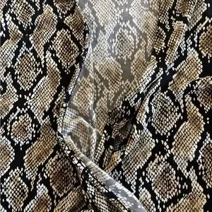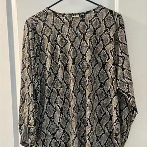 Stylish blouse with a bold pattern. Features a clasp V-neck and long sleeves. Perfect for versatile wear or business casual. New with tags, never worn.