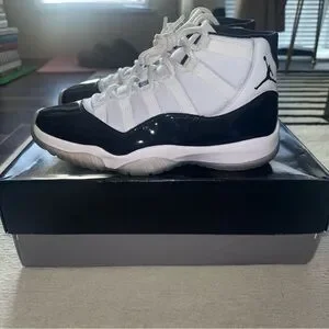 The product is an Air Jordan 11 Retro Concord 2018 Men's Size 8 sneaker. It features a high top style with a white and black color scheme, made of patent leather material. This model from the Air Jordan product line showcases the iconic Concord design, released in 2018 with a style code of 378037-100. Perfect for athletic use and a collector's item for fans of the Jordan brand.