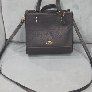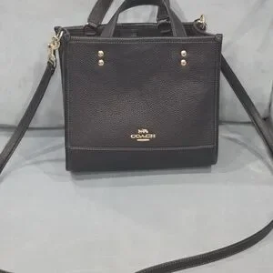 Elegant black leather handbag with gold accents. Features a sleek design and adjustable strap.