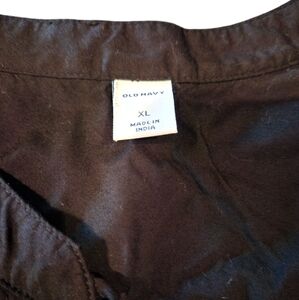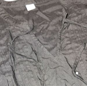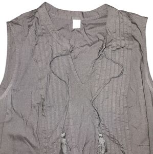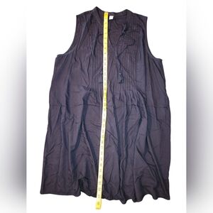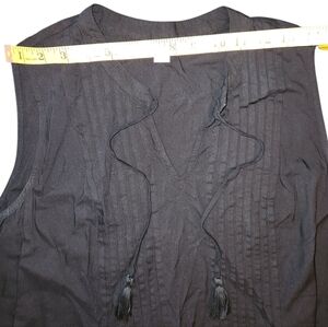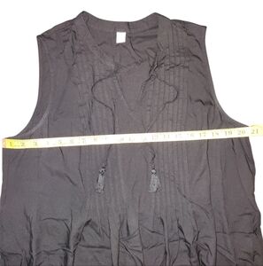 Lightweight sleeveless black pleated bib front with tassel ties at neckline. A-line free-flowing knee-length dress.