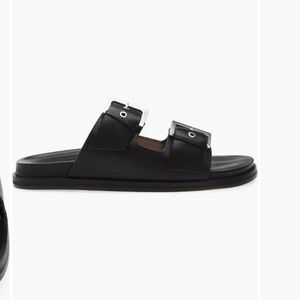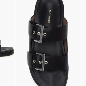 All Saints slides / Sandals : Soft leather straps with gleaming logo-embellished buckles secure a classic slide sandal grounded by a contoured footbed and flat sole.