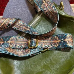 Stylish olive green crossbody bag with a unique patterned strap. Perfect for everyday use. Never used. Very cute and has an inner small zipper pocket. The green mark on the lining of the bag in the last picture is from the manufacturer.