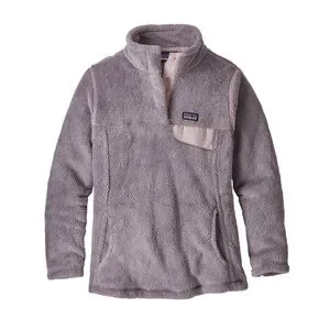 Cozy purple fleece pullover by Patagonia. Features a soft texture and a front pocket. Would fit a slight/petite woman or a teen 12-14
