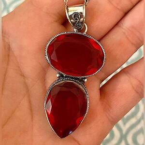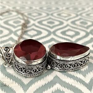 Antique Ruby Pendant Necklace, Sterling Silver, Double Gemstone, Stateme…