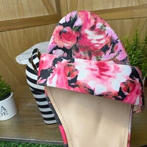 These striking JustFab heels feature a captivating blend of pink floral prints and bold black accents.