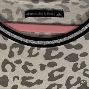 This Abercrombie & Fitch t-shirt is a stylish and comfortable addition to any wardrobe. The top features a classic gray leopard print on a white background, giving it a modern and trendy look. The ribbed neckline is accented with a black and silver glitter stripe, adding a touch of sparkle. Made from a soft, lightweight fabric, this tee is perfect for everyday wear. It's a size large and has a relaxed fit, making it versatile and easy to style.