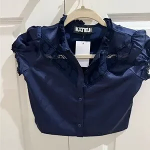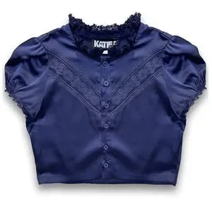 Chic navy satin blouse with delicate lace accents. Features puff sleeves and button-up closure.