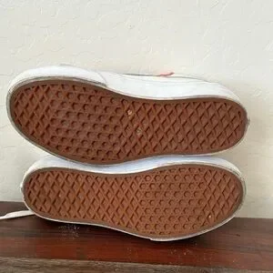 Stylish Vans high-tops with coral, light blue, and beige tones. Perfect for everyday wear. Excellent condition.