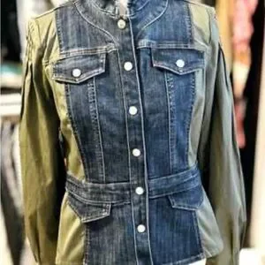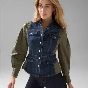 White House Black Market Denim jacket with olive green sleeves and detail. Statement piece. Size Medium, never worn