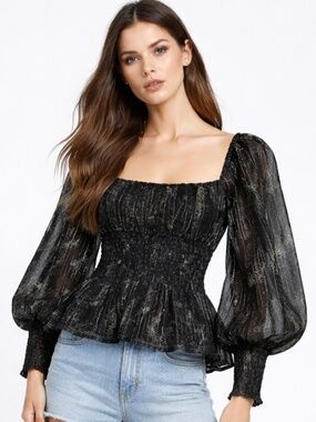 Meet your new “wow” top! This black beauty is sprinkled with golden shimmer and tiny floral whispers—like a night sky you can wear. The smocked bodice hugs in all the right places, while the peplum hem adds a flirty little flair. And those puff sleeves? Total drama… the good kind.