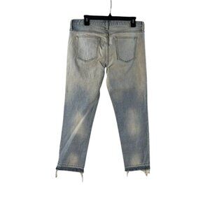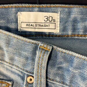 These Gap Real Straight jeans in a light wash are styled with a relaxed, vintage feel. The frayed hem adds a touch of character, making them a unique wardrobe staple. Comfortable and versatile, they are ideal for everyday wear, exuding a timeless charm that pairs effortlessly with various outfits.