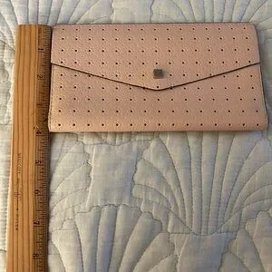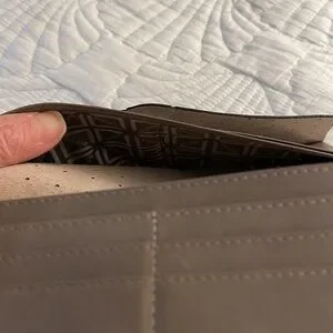 LODIS leather wallet has a snap closure. There are twelve slots for credit card, ID, license, etc. The interior also has a zipper storage for bills and on either side of zipper compartment there is another compartment for storing receipts, etc. all three compartments are lined with the Lodis logo. There’s also another lined compartment across from the these three compartments. This Lodis wallet is a cream shade with a very light pinkish undertone with silver color hardware.