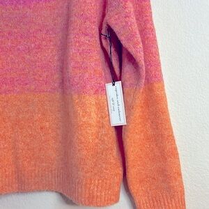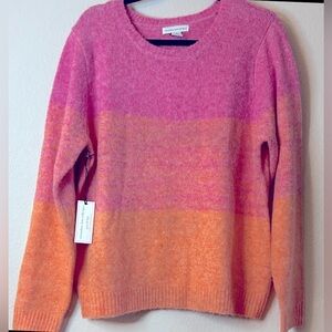 Chic crew neck sweater with vibrant pink and orange hues. Perfect for a bold look.