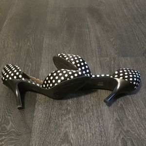 Elegant peep toe design. Classic polka dot pattern. Perfect for any occasion. Excellent condition. Worn once. No box.