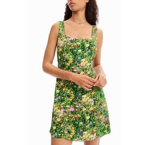 Desigual Dress Womens Size S Green Multi-Color Floral Short Tank Style Rear Zip Square Neck, Vibrant Aesthetic