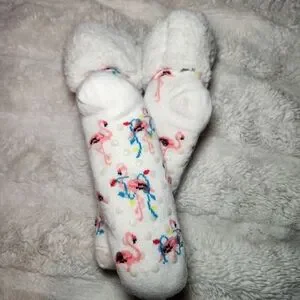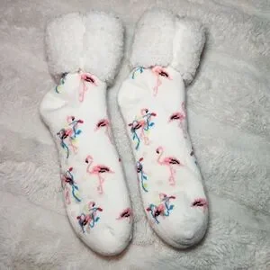 Stay warm and stylish with these adorable flamingo with Christmas lights print slipper socks. Featuring a plush white sherpa lining for extra comfort, non-slip grippers on the soles for safety, and a fun tropical flamingo design on a cream background. Perfect for lounging around the house or keeping your toes toasty on chilly nights.