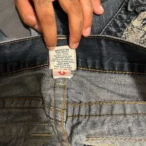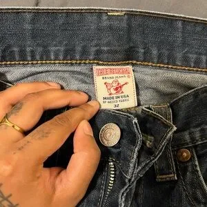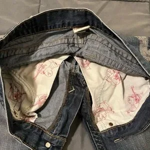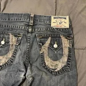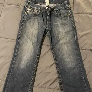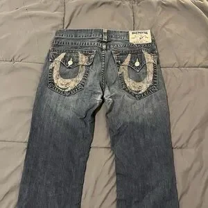 True Religion Relaxed Blue Jeans with Tan Accents