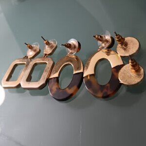 ONLY **1** LOT LEFT!!! ANN TAYLOR 3pc LOT Geometric Brown & Black Tortoise Drop+Black Crystal Earrings**INCLUDES 3 Pairs of Earrings: 1) Earrings have a Rectangle Post with a Brown & Black Tortoise Design with an Open Rectangle (Top portion is Gold/Bottom Portion has a Black & Brown Tortoise Design)~1.7" LONG 2) Earrings have a Round Post with a Brown Tortoise Design with an Open Oval (Top portion is Gold/Bottom Portion has a Brown Tortoise Design)~1.65" LONG 3) Earrings are Gold with a Large Round Faceted Black Crystal~.5" LONG**If you Love Tortoise Jewelry these Earrings are calling your name! Earrings are in pre-loved condition and show wear~Gold on the Square Tortoise Earrings has faded on one of the earrings~There are scratches on the Gold of the Oval Tortoise Earrings~No call outs on the 3rd Pair**Earrings have Post Backs