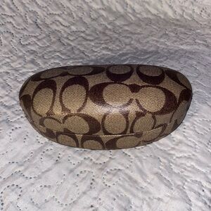Elegant Coach clamshell eyeglass case with signature pattern. Rich brown interior. Classic design. 6.6” x 3”