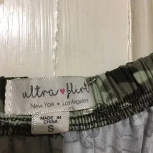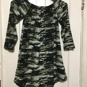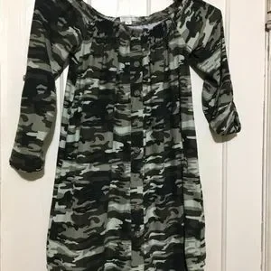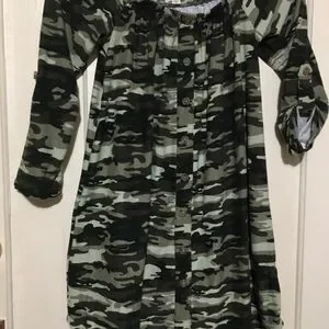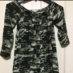 a camouflage print off-the-shoulder mini dress with a button-down front and 3/4 length roll-tab sleeves. In great condition very nice short dress