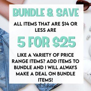 All items $13 and under are 5 for $25. Add to bundle and I will adjust the price. Like other items that are not 5 for $25? Add all items to bundle and send me a comment! I love bundles and will always discount bundles. The more you bundle, the more you save! :)