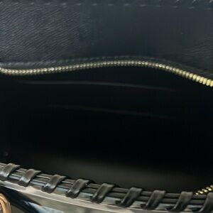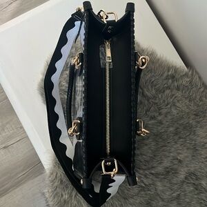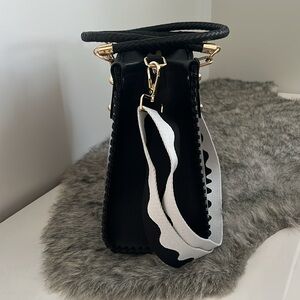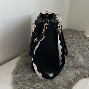 The wide, adjustable black and white woven fabric crossbody strap is detachable and measures about 1.5” wide x 30-53” long. This purse also has 17 1/2” total length black braided vegan leather handles great for slipping over your shoulder.
