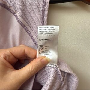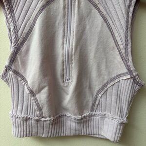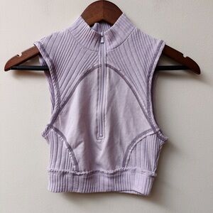 In excellent condition, very trendy light purple top with zipper. It does stretch, second measurement photo shows to how much.