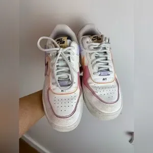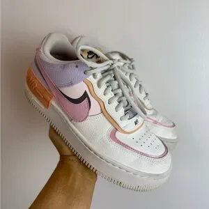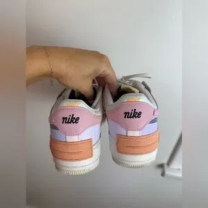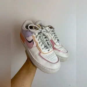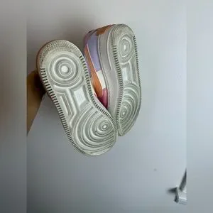 Chic Nike Air Force 1 with pastel pink and purple hues. Features a sleek design with a touch of orange.