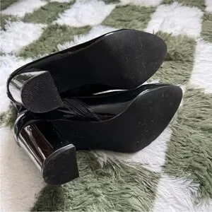Black patent “Stoker” faux leather ankle boots from Nasty Gal. Shiny black boots with silver heels, almost sock boot style. Size 8.5 fit tts. Some light scuffing shown in pictures. Otherwise guc and are comfortable! Have working side zippers, and the inside has a sort of fleece lining. Great for dancing and parties! The chunky heel is easy to move in.