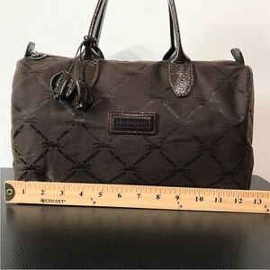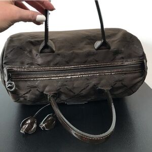 Longchamp Speedy 30 Duffel Bag Jacquard Monogram Brown Patent Leather Trim Satchel Purse