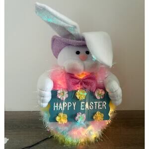 Cute vintage Easter rabbit themed fiber optic holiday table decor. This piece has been tested and works perfectly. The fiber optic strands change an array of colors and dance back and forth through a sparkling rainbow performance. It is in great condition with no signs of heavy wear such as staining, breaks or holes in the soft fabric material. It is sure to make a charming addition to anyone’s home this upcoming Easter holiday.